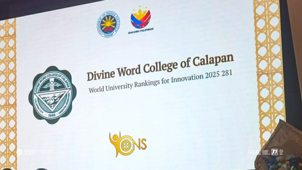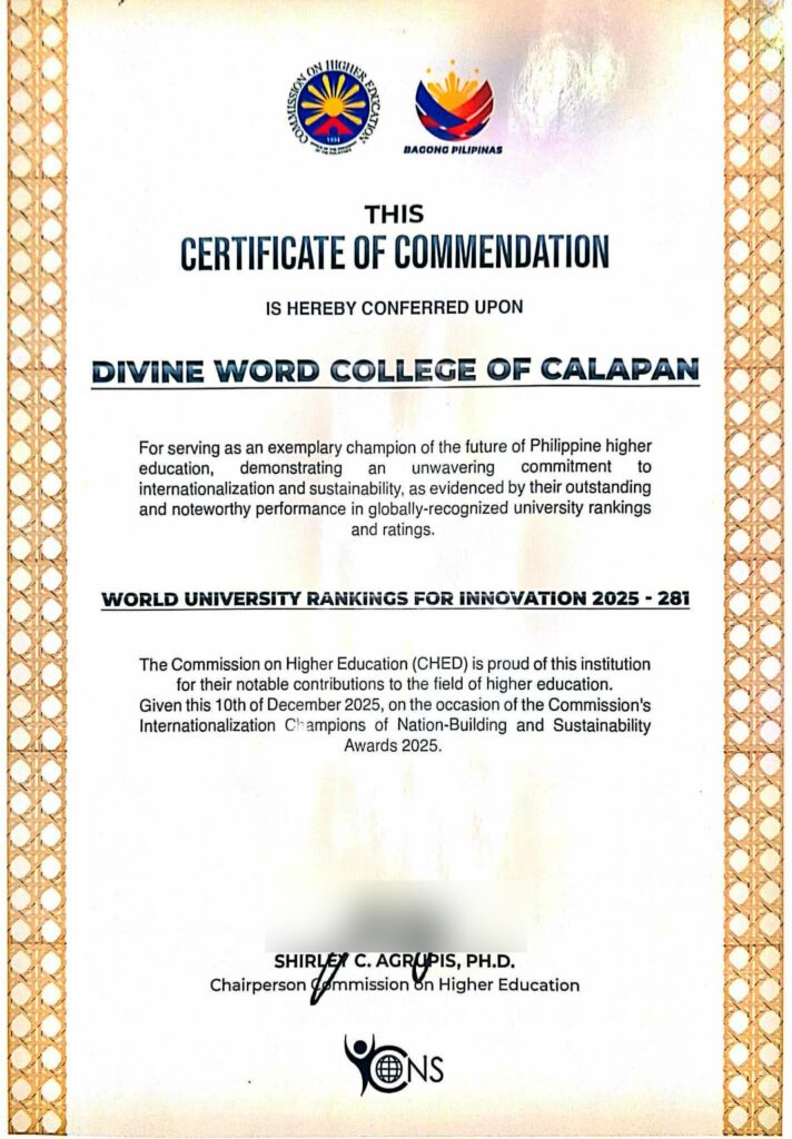 The Divine Word College of Calapan, Inc. has been formally recognized by the Commission on Higher Education (CHED) for its exemplary commitment to internationalization, sustainability, and innovation in higher education. DWCC received a Certificate of Commendation for its outstanding and noteworthy performance in the World University Rankings for Innovation (WURI) 2025, where the institution placed 281st globally.