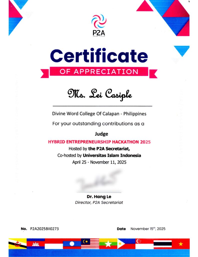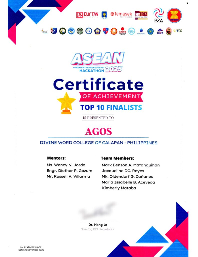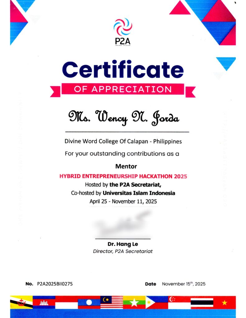 Divine Word College of Calapan proudly celebrates ๐ง๐ฒ๐ฎ๐บ ๐๐๐ข๐ฆ, a collaborative team composed of students from the School of Information and Technology, School of Engineering, and School of Business, Hospitality, and Tourism Management, for being a Top 10 finalist in the ๐๐๐ ๐๐๐๐๐ ๐๐ซ๐๐๐ง ๐๐ง๐ญ๐ซ๐๐ฉ๐ซ๐๐ง๐๐ฎ๐ซ๐ฌ๐ก๐ข๐ฉ ๐๐๐๐ค๐๐ญ๐ก๐จ๐ง ๐๐๐๐, showcasing the regionโs brightest young innovators.