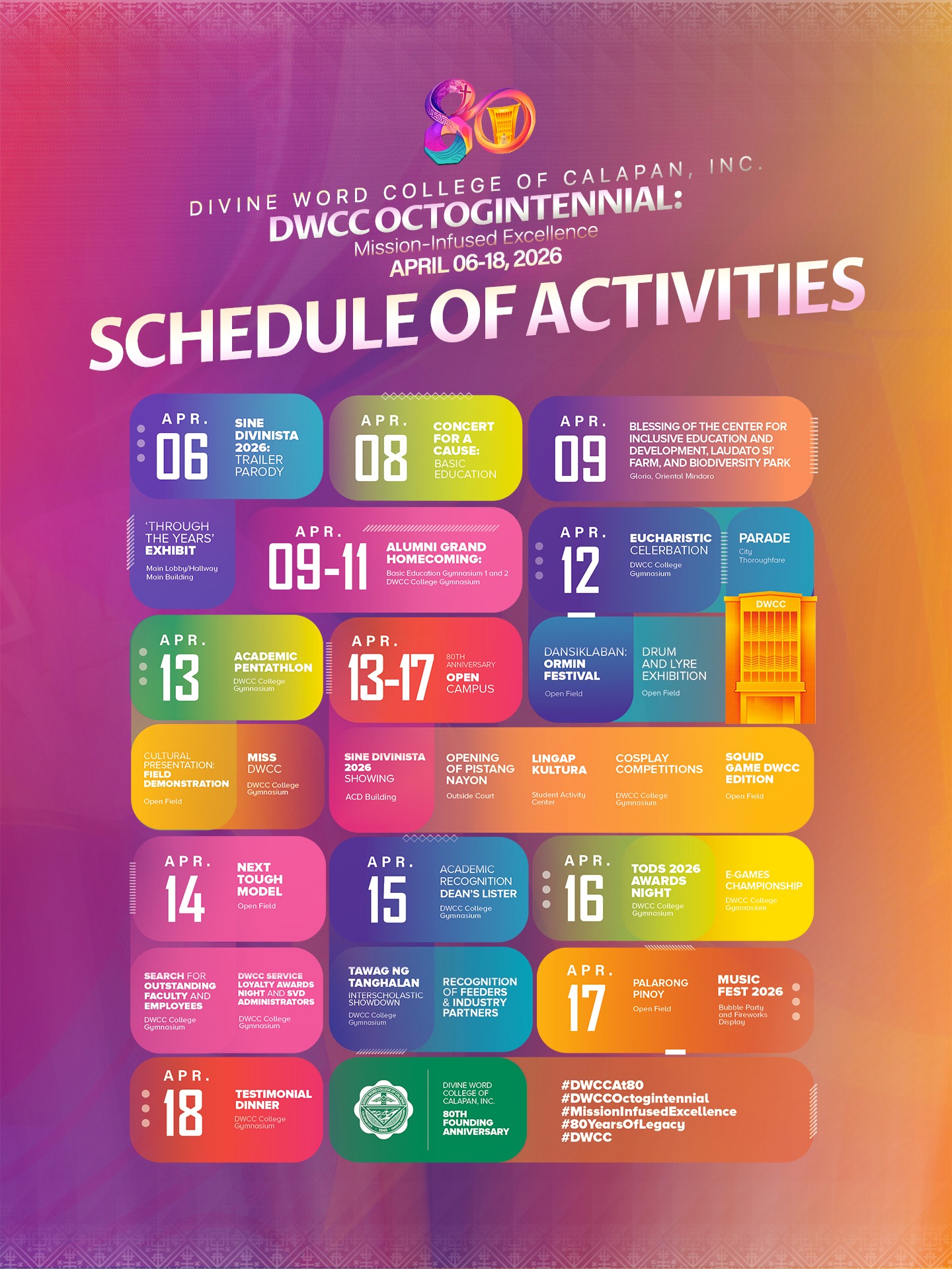 Join us as we commemorate eight decades of faith, excellence, service, and legacy through a meaningful lineup of events and activities prepared for the entire DWCC community.
