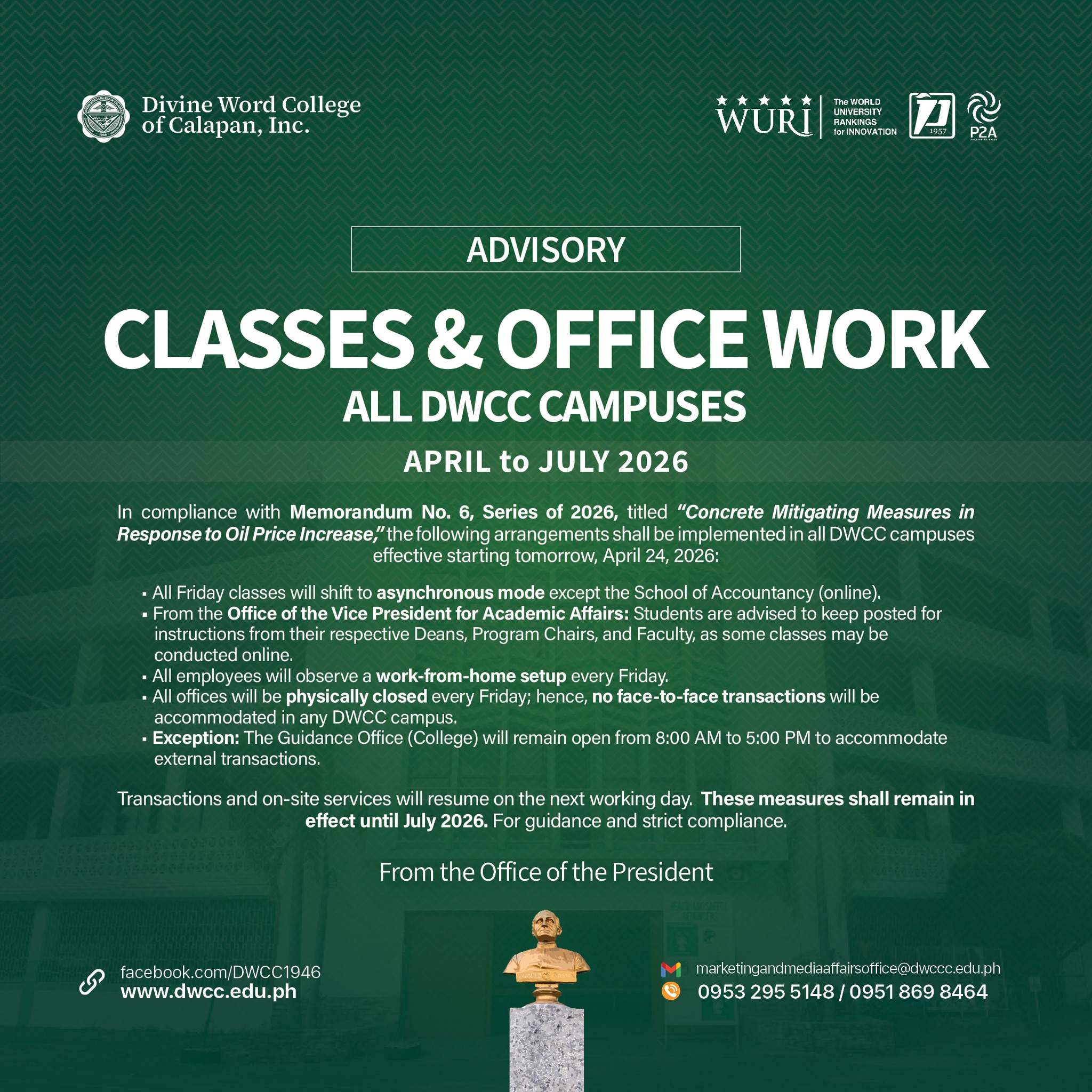 π—˜π˜…π—°π—²π—½π˜π—Άπ—Όπ—»: The Guidance Office (College) will remain open from 8:00 AM to 5:00 PM to accommodate external transactions.